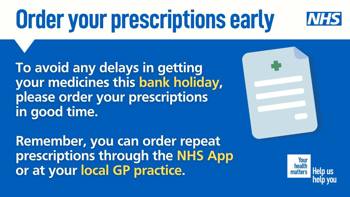 The NHS is advising that repeat prescriptions should be ordered at least seven working days ahead of the bank holiday to guarantee that they will be available in time.